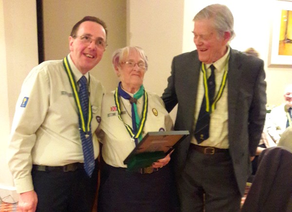The picture shows Brenda Dodd from Warrington East receiving her Silver Wolf, the highest adult award for service to Scouting in the UK.