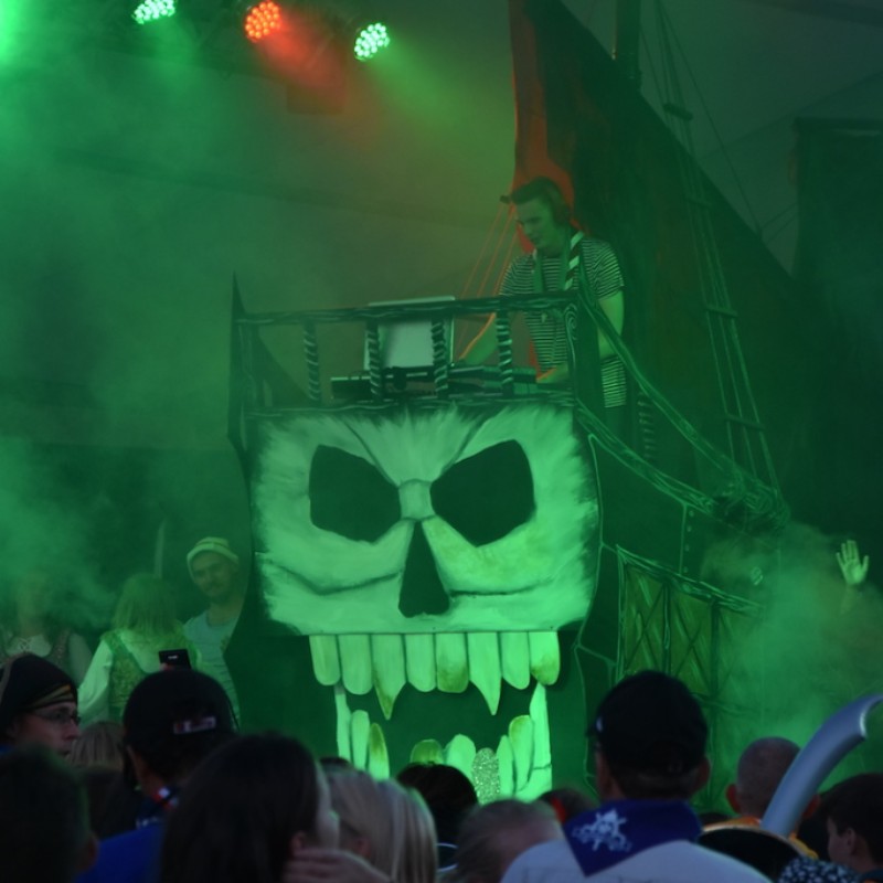 Keeping with the theme of Chamboree, Totie Driver, west end stage designer was drafted in and devised a full working pirate ship on stage that could be moved and fixed in various positions to create a different stage look and feel for each of our performances, the galleon was created by Phil Turnbull and his team and took approx 3 months to create. We saw the ship change positions most nights and it was decorated in various colours to represent the two characters ships from Story of Chambo, Captain Jack Chambo’s ship and Captain Corrupts ship, We also saw the galleon become a DJ booth in the back of the ship (stern) this really gave the participants a feeling of being at a live DJ set much like the nightclubs of Ibiza.