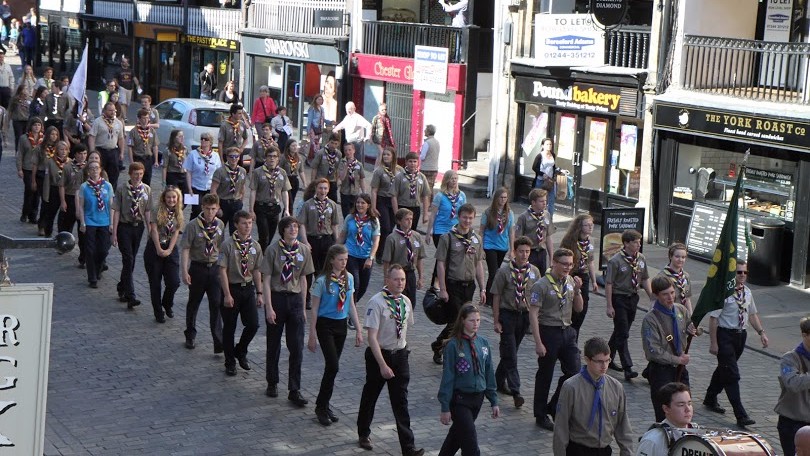 15:15- Once formed up, we march out of Abbey Square, led by Alderley District Scout Band, a circular route of the city centre streets and then into the Cathedral for 15:30.